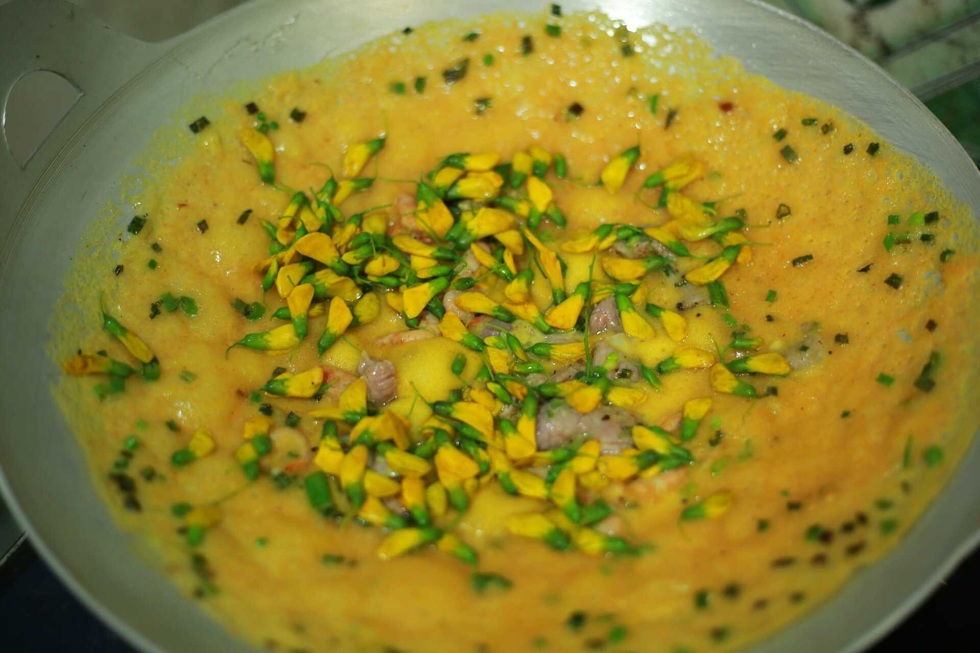 Tép đồng được rửa sạch, chiên vàng hoặc xào chín. Hoa chọn loại tươi nhất, bỏ cọng già và bông úa, rửa sạch, để ráo. Kết hợp thêm hành tây thái sợi, rau răm thái nhỏ, cọng bông súng, nêm nước mắm pha đủ vị chua, cay, mặn, ngọt.