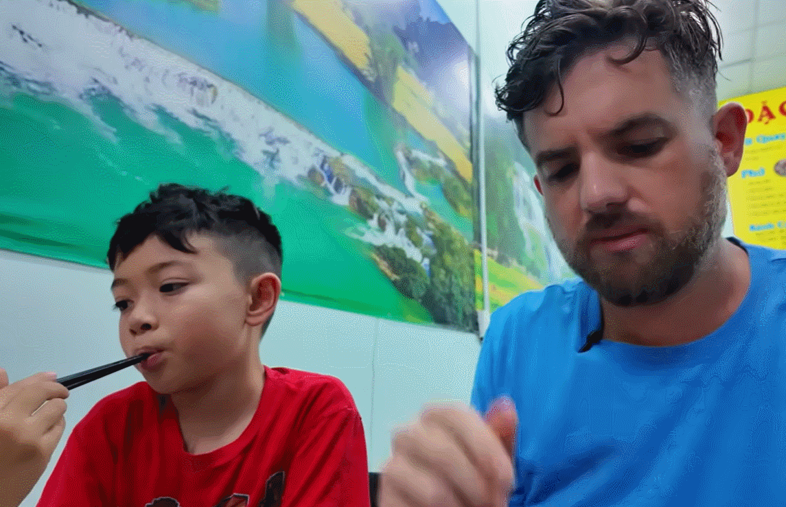 Mới đây, Chad đưa con trai và Michael - một người bạn của Chad - ghé quán ăn chuyên đặc sản Huế ở TPHCM. Anh từng đi qua quán ăn này nhưng đây là lần đầu đến để thưởng thức.
