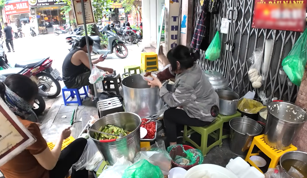 Nữ du khách tìm đến một quán xôi vỉa hè trên phố Bát Sứ (phường Hoàn Kiếm). Gọi là “quán”, nhưng không gian ở đây khá khiêm tốn, chỉ có vài dụng cụ đựng nguyên liệu, đồ ăn và chừng chục chiếc ghế nhựa cho khách ngồi ăn tại chỗ.