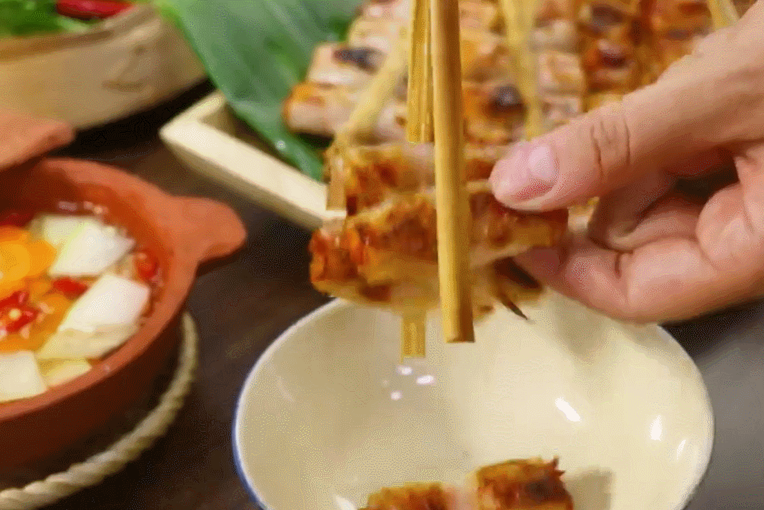 Vị khách nước ngoài tiếp tục thưởng thức và nhận xét chả lá lốt có hương vị giống một loại xúc xích từng ăn. Gạch cua béo ngậy, mềm mềm.