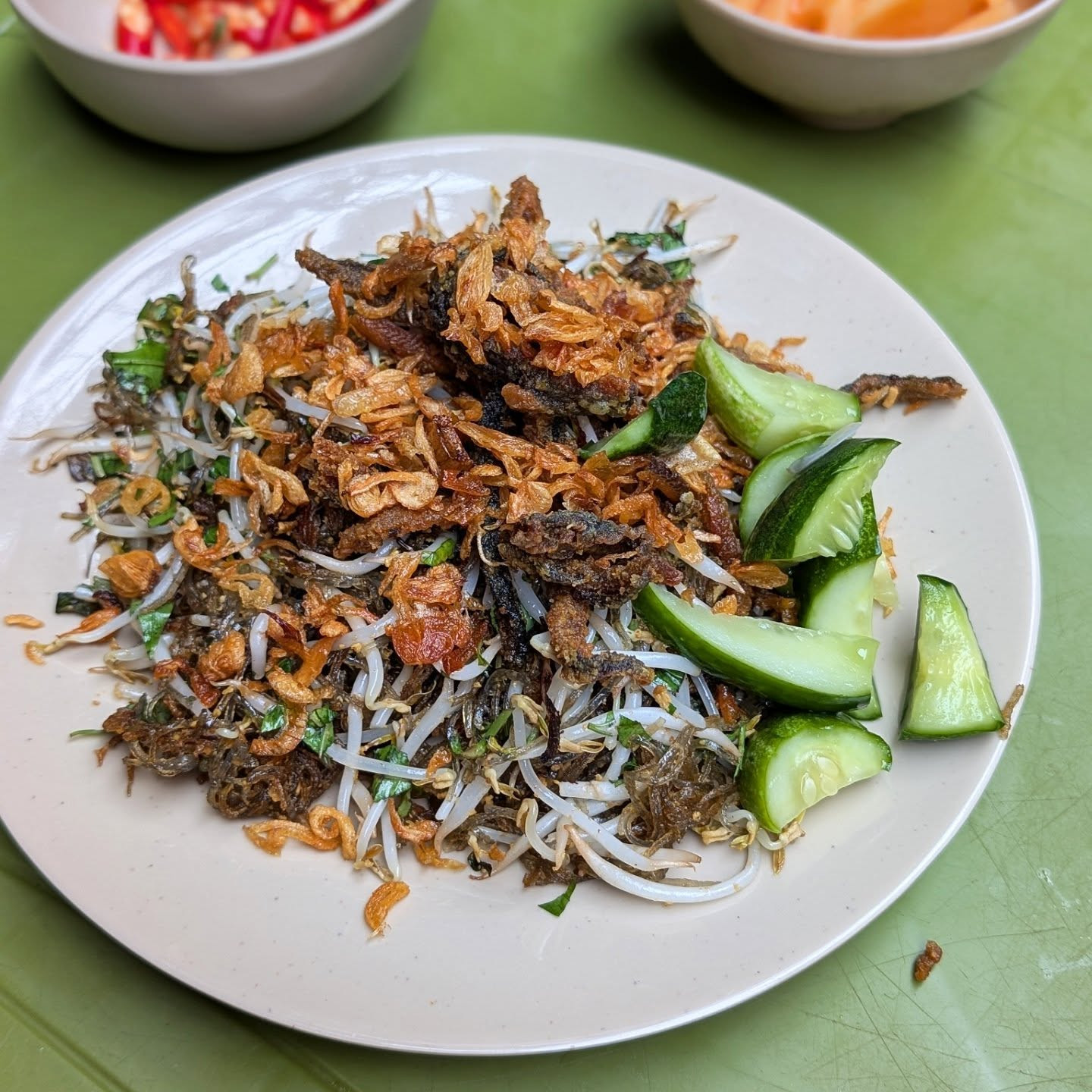 "Tôi thích các món sợi khô ở Việt Nam vì chủ quán sẽ phục vụ kèm một bát nước dùng, hương vị rất ngon. Đầu bếp sử dụng nguyên liệu đa dạng và khéo léo. Mì mềm được kết hợp với giá đỗ, hành phi, đậu phộng giòn, tạo nên sự hài hòa", Steph nhận xét.