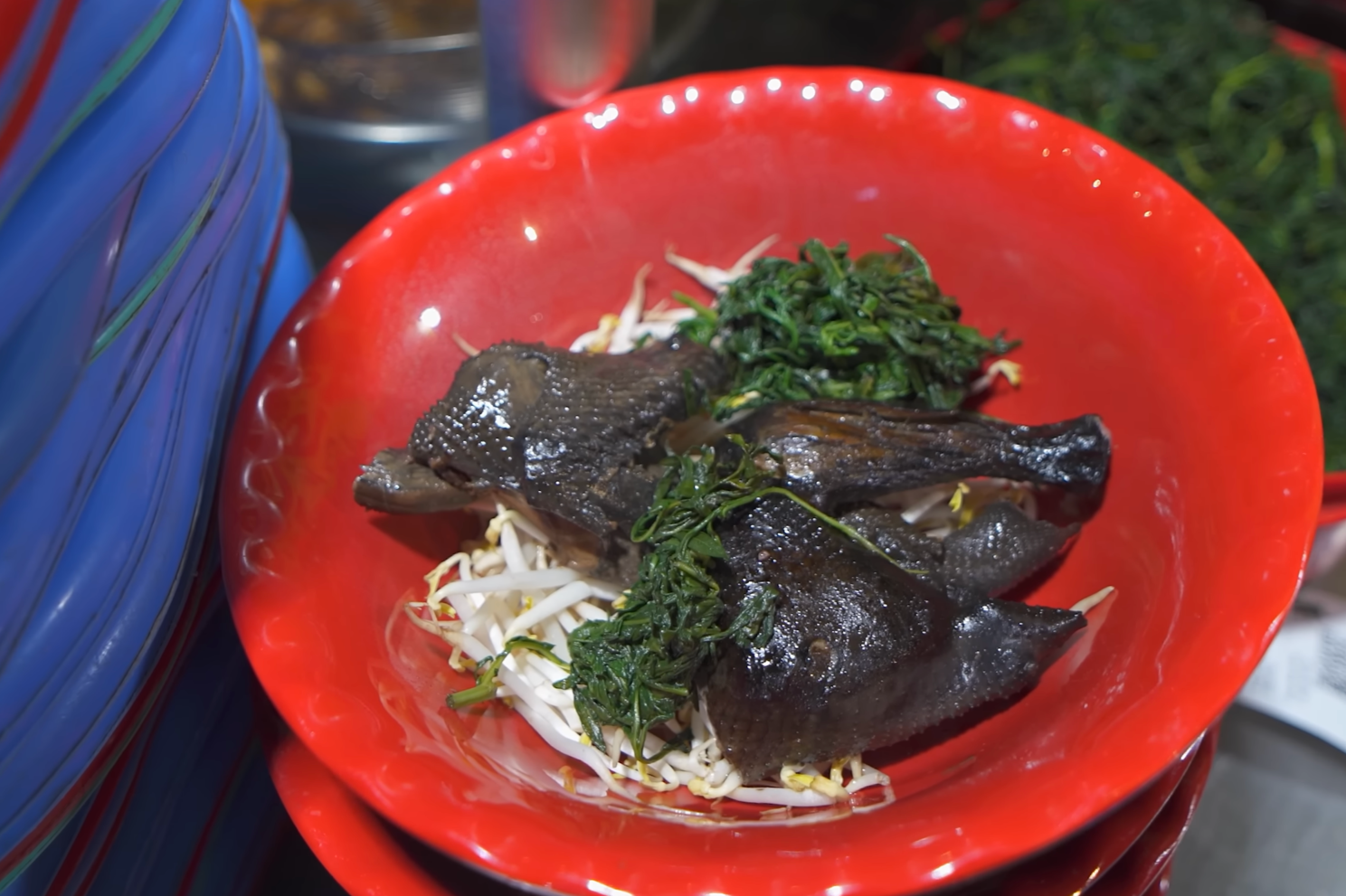 Chris và Steph chọn thưởng thức mì gà đen tần, ăn kèm trứng non. Ngay khi bát mì được bưng ra, cả hai lập tức bị cuốn hút bởi hương thơm thảo mộc tỏa ra từ nước dùng. Nếm thử, họ bất ngờ với vị đắng nhẹ nhưng hài hòa, “kết hợp với mì tôm lại hợp đến lạ”.