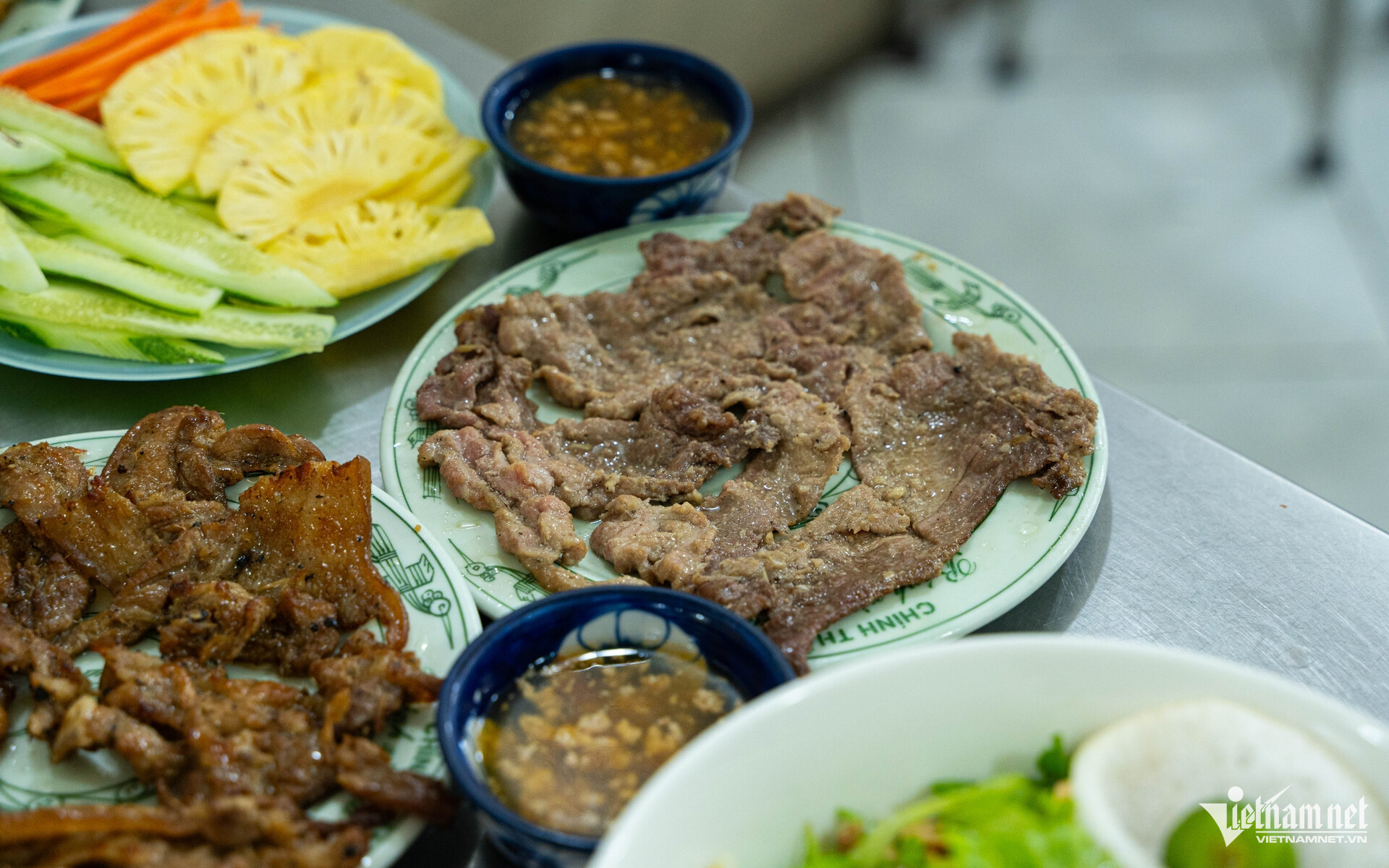 Bò nướng cũng là món được nhiều thực khách yêu thích của quán. Thịt bò thăn tươi rói được thái lát rồi ướp với 7 gia vị theo công thức gia truyền trong 2 tiếng.