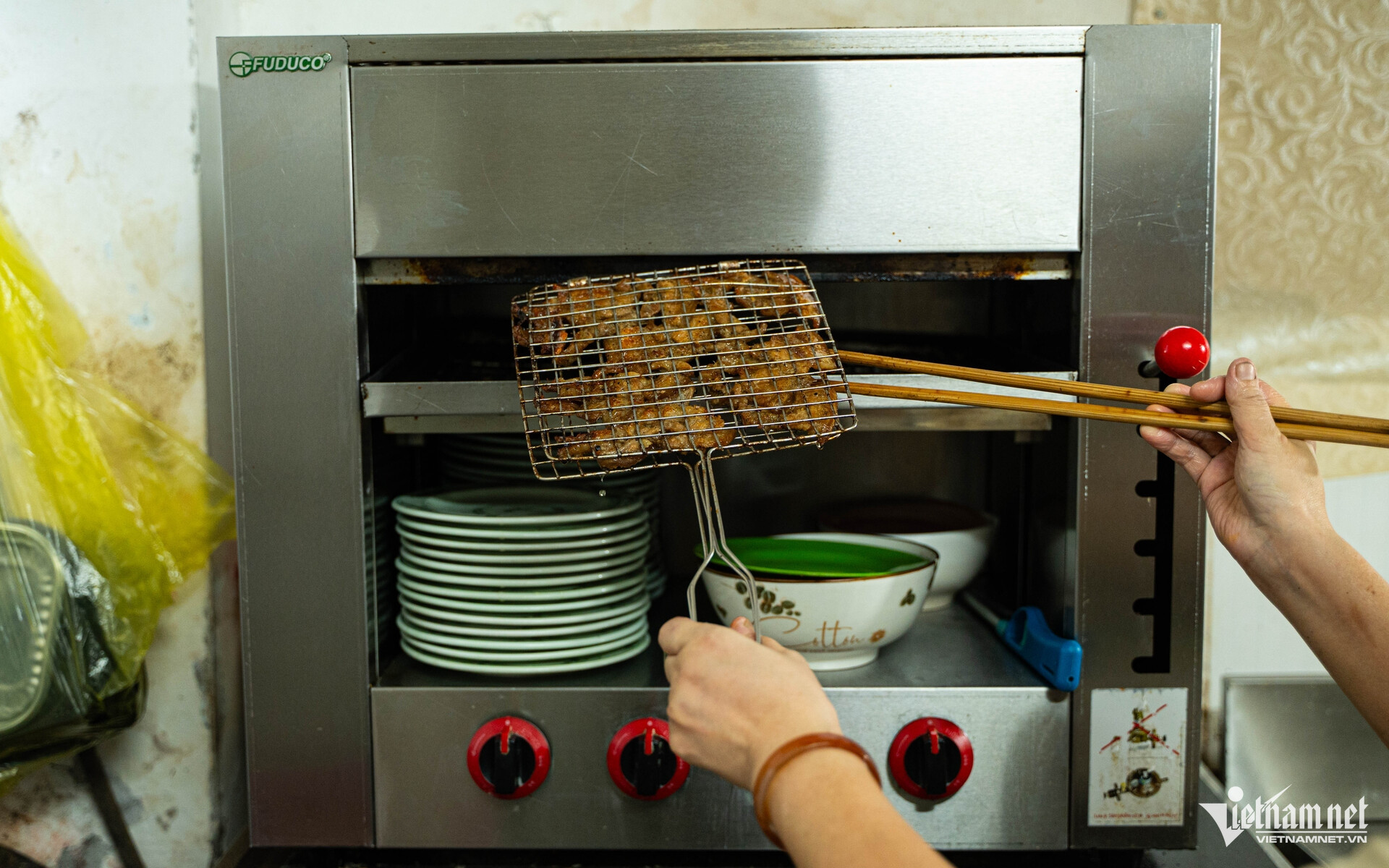 Khác với trước đây, thịt bò bây giờ nướng bằng bếp hồng ngoại để giảm bớt khói. Mỗi mẻ thịt được nướng trong 10-15 phút, khách gọi tới đâu nướng tới đó để thịt mềm mướt, không bị khô.