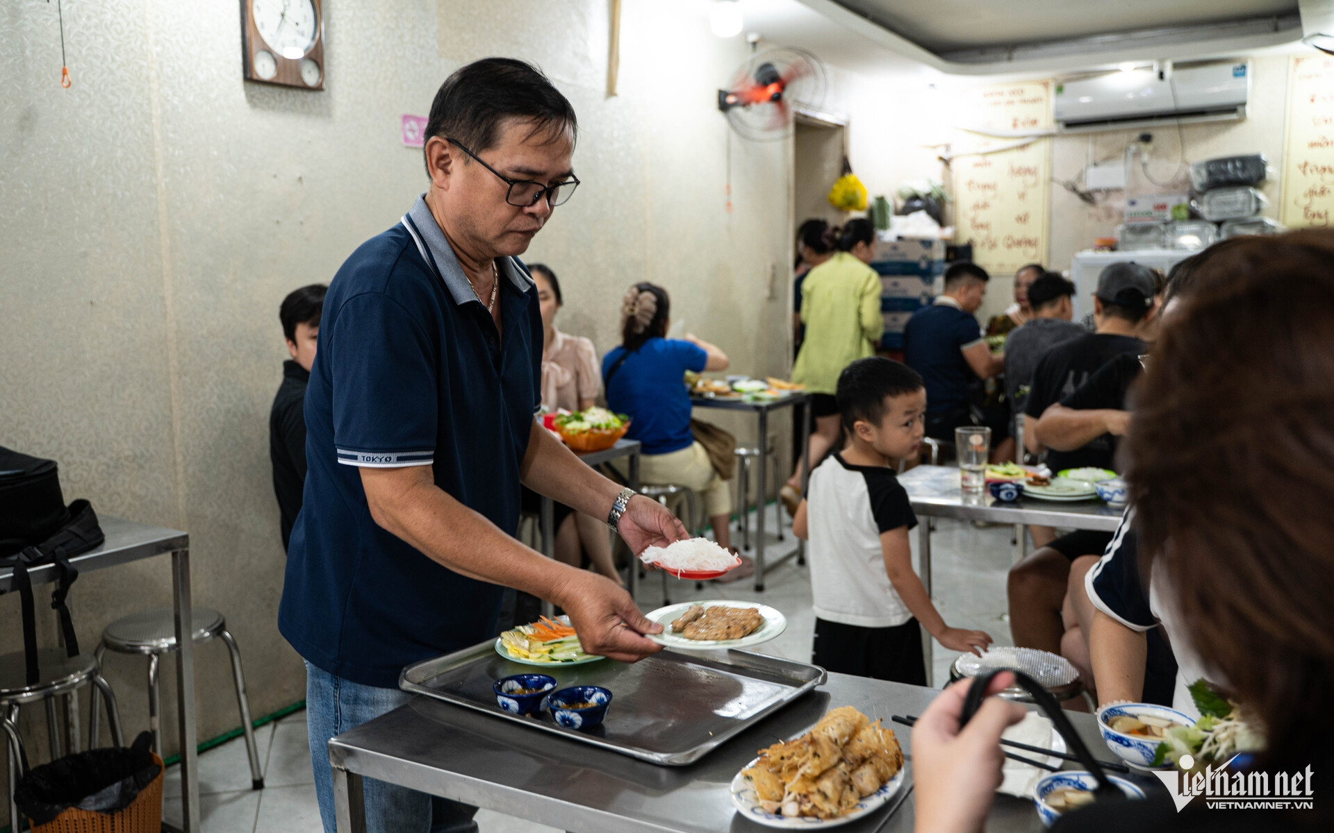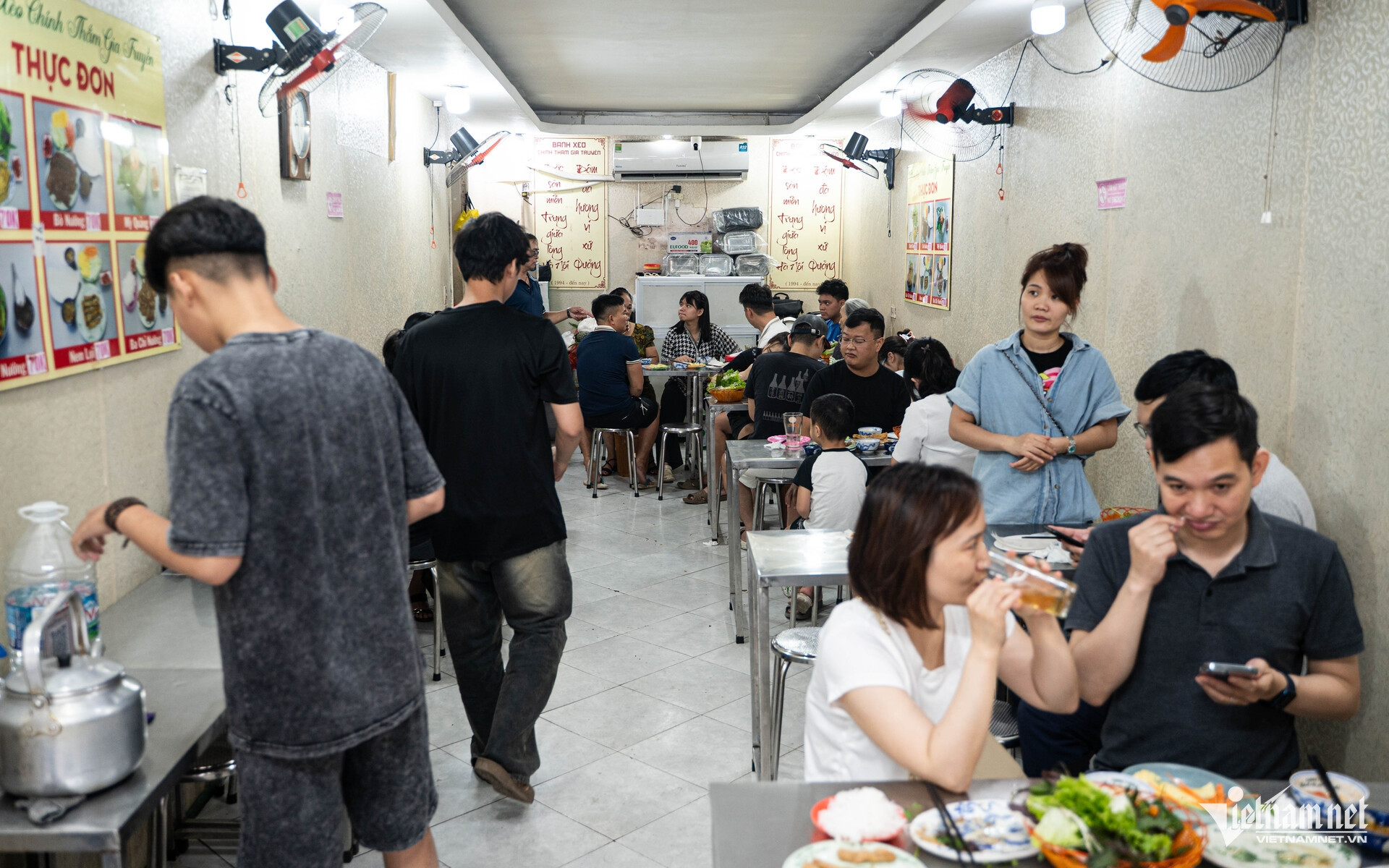 Anh Linh (41 tuổi, Hà Nội) và vợ đã ăn bánh xèo tại quán ông Chính từ thời mới yêu, khoảng 20 năm trước. Hiện nay, anh chị vẫn thường xuyên đưa con, người thân hay bạn bè tới đây ăn "đổi bữa".